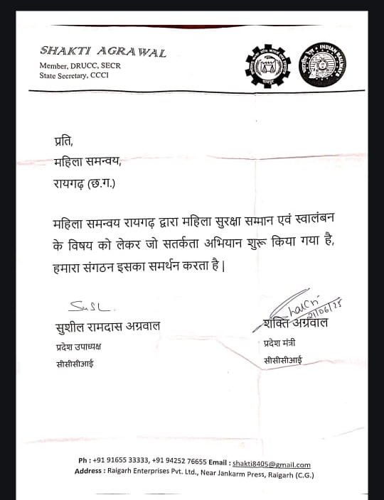 श्री अग्रवाल ने पत्र में उल्लेख किया है कि, “महिला समन्वय रायगढ़ द्वारा जो अभियान शुरू किया गया है, वह एक अत्यंत आवश्यक और प्रशंसनीय पहल है। हमारा संगठन इस जागरूकता अभियान का पूर्ण समर्थन करता है।”