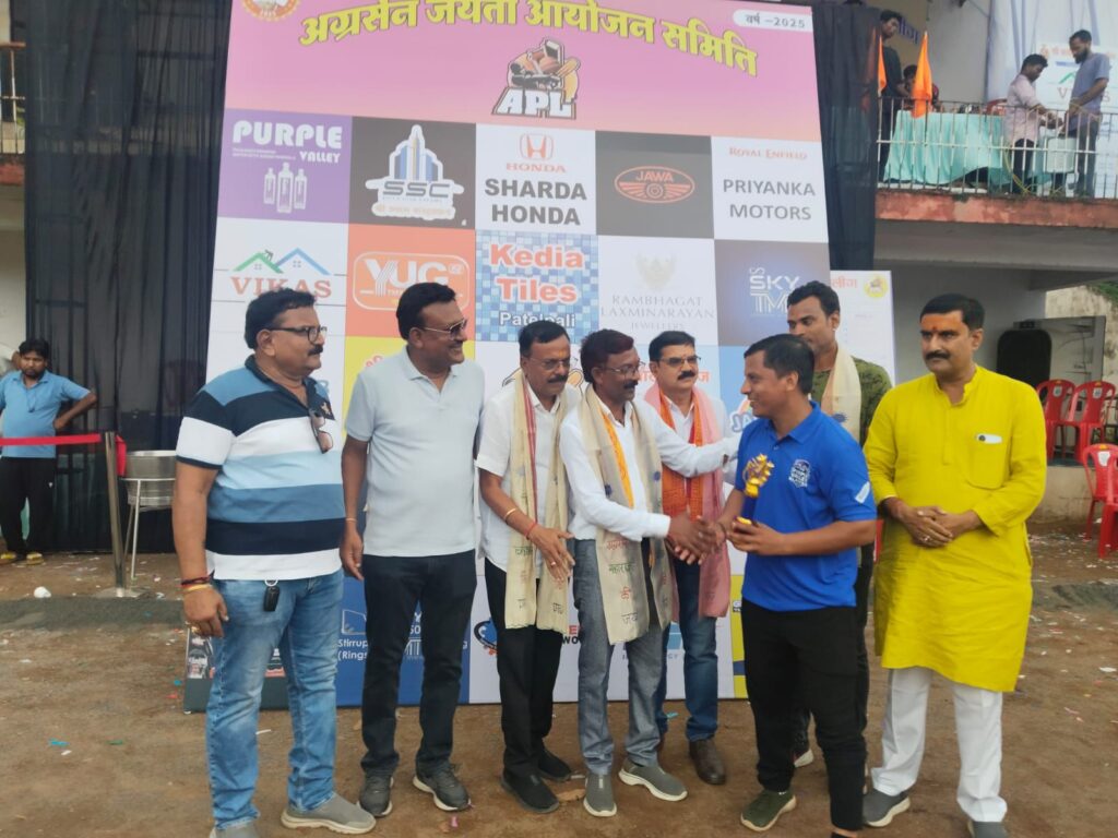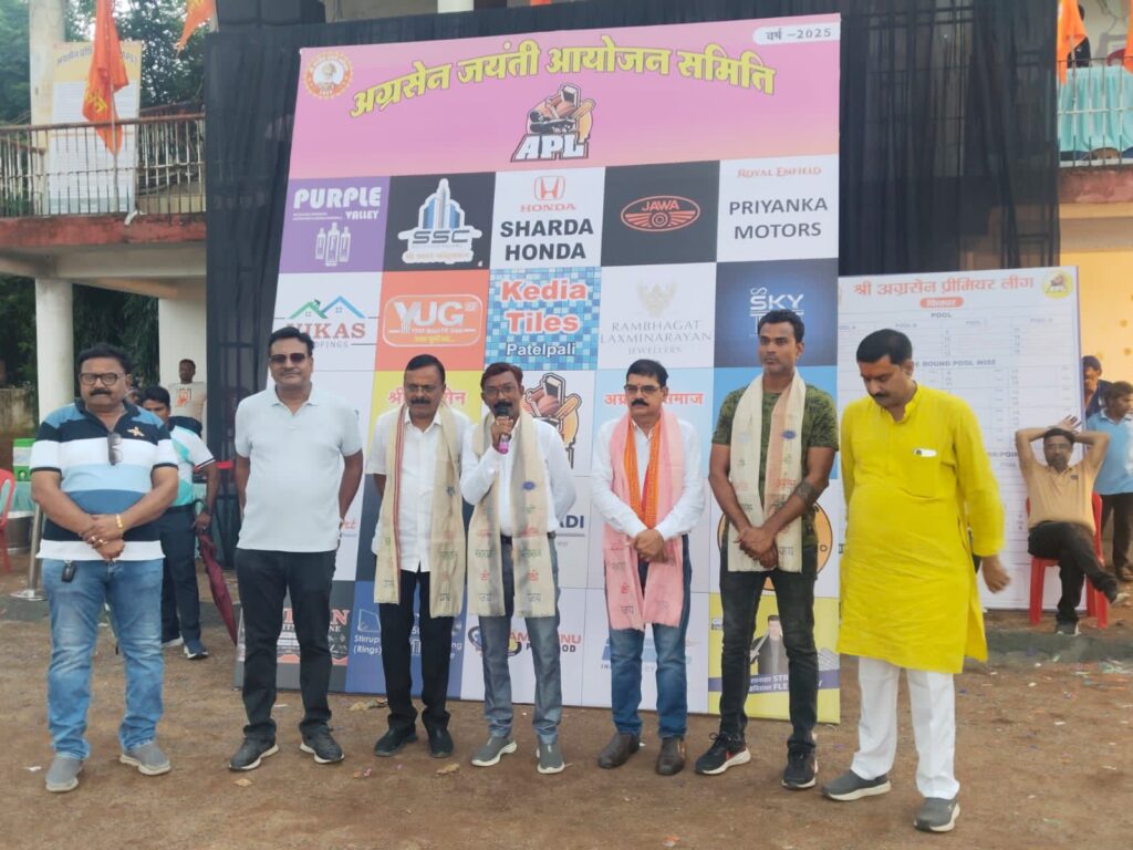 रायगढ़ :- शहर का अग्र समाज महाराजा अग्रसेन के बताए सिद्धांतों का अनुशरण कर रहा है। उक्त बाते महापौर जीवर्धन चौहान ने अग्र कुलदेव महाराजा अग्रसेन जी की 5149 वीं जयंती को ऐतिहासिक क्रिकेट प्रतियोगिता के उदघाटन के दौरान कही। मंच से उन्होंने सुनील लेंध्रा के समाजिक योगदान को मिशाल बताते हुए कहा दानवीर सेठ किरोड़ीमल की नगरी में इस समाज में दान की परम्परा को अक्षुण्ण बनाए रखा । कार्यक्रम के संयोजक सुनील लेंध्रा, अध्यक्ष अनूप रतेरिया, अशोक अग्रवाल (ब्लूचीप) मनीष पालीवाल,उपाध्यक्ष मनीष अग्रवाल (दवाई) कमलेश रतेरिया, आर्यन अग्रवाल,प्रचार प्रसार प्रमुख अधीश रतेरिया, ऐश अग्रवाल, महिला अध्यक्ष श्रीमती रेखा महमिया, कविता बेरीवाल, उपाध्यक्ष रीना बापोड़िया, शालू गोयल, कशिश अग्रवाल के विशेष मार्गदर्शन में भव्यता दी जा रही है। जिसमें समाज के सभी लोग बहुमूल्य योगदान दे रहे हैं।