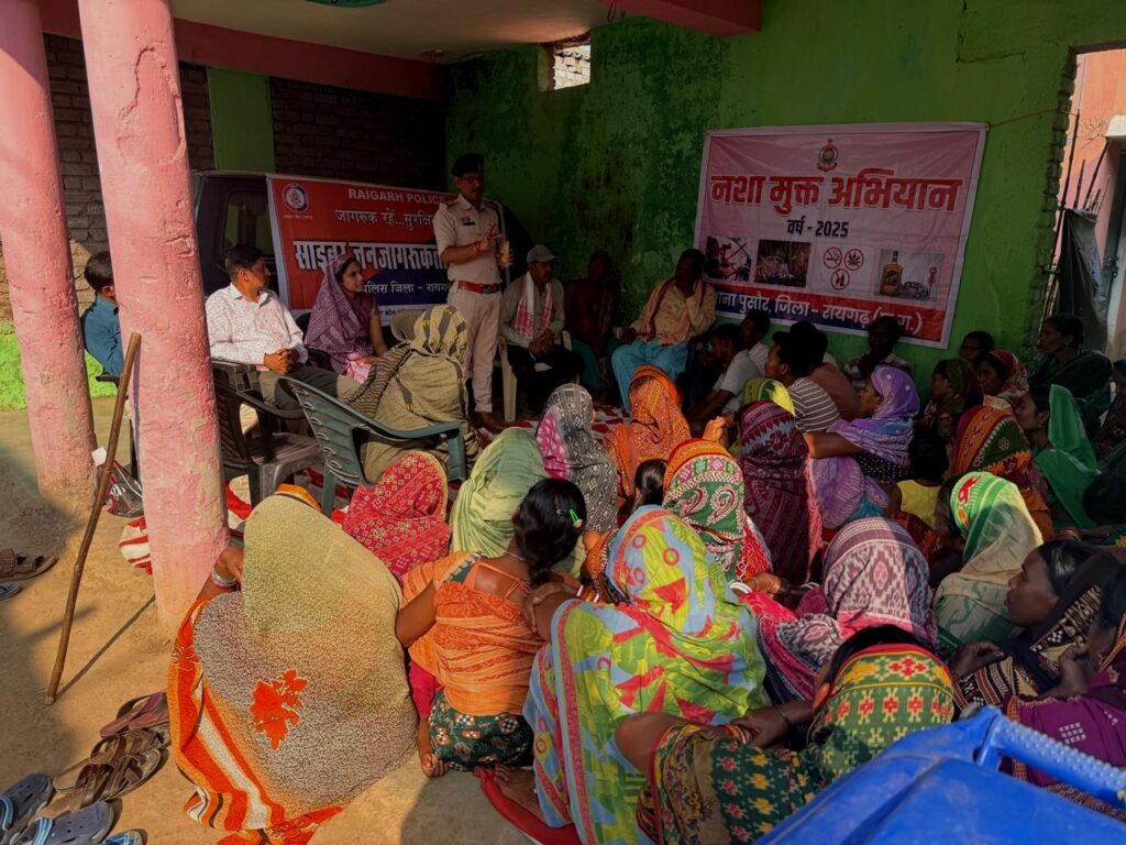 रायगढ़, 11 नवम्बर 2025 — पुलिस अधीक्षक दिव्यांग कुमार पटेल के निर्देशन में जिले में Nasha Virodhi Abhiyan को प्रभावशाली रूप से लागू किया जा रहा है। थाना और चौकी स्तर के पुलिस अधिकारी अपने अमले के साथ गांव-गांव जाकर चौपाल लगाते हुए ग्रामीणों को नशे के दुष्प्रभावों और सामाजिक व कानूनी प्रभावों से अवगत करा रहे हैं।