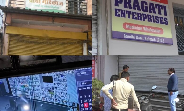 चोरों ने प्रगति इंटरप्राइजेज और प्राची मेडिकल स्टोर के ताले तोड़कर वारदात को अंजाम दिया। पूरी घटना पास में लगे सीसीटीवी कैमरों में कैद हो गई है, जिसमें चार नकाबपोश चोर स्पष्ट रूप से दिखाई दे रहे हैं।