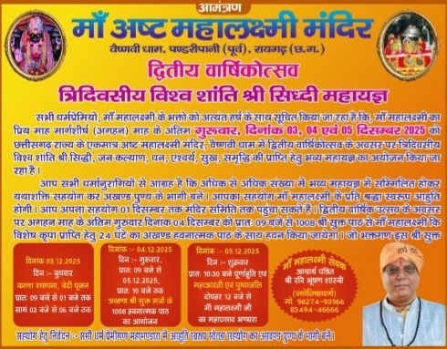 मां Mahalakshmi Mandir Pandripani की द्वितीय वर्षगांठ पर तीन दिवसीय भव्य आयोजन घोषित