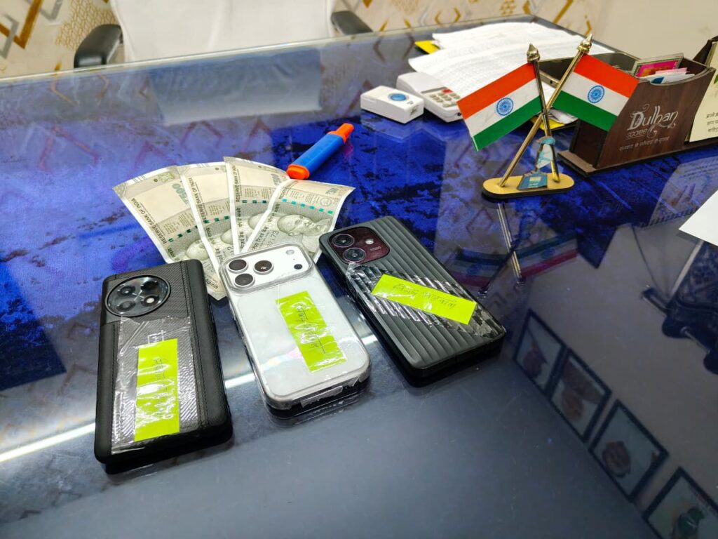- छापेमारी में विकास अग्रवाल और विनय अग्रवाल को एक कमरे में तीन मोबाइल फोन से ऑनलाइन सट्टा लेते हुए पकड़ा गया।
