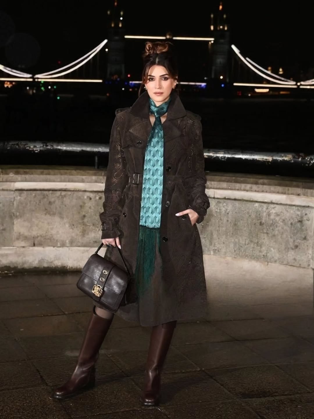 इस अवसर पर कृति ने बरबेरी के परिधान में टेक्सचर के संतुलन और विरासत की झलक पेश की। उन्होंने चॉकलेट-भूरे रंग का आकर्षक ट्रेंच कोट पहना, जो उनके पूरे लुक का मुख्य आधार था। संरचित सिल्हूट और कमर पर बंधी बेल्ट ने उनके व्यक्तित्व में कालातीत गरिमा और आत्मविश्वास जोड़ा। मोनोक्रोम रंग संयोजन को तोड़ते हुए उन्होंने जीवंत टील रंग का पैटर्न वाला स्कार्फ पहना, जिसने लुक में ताजगी और दृश्यात्मक विविधता जोड़ी। इसके साथ उन्होंने घुटनों तक के स्लीक लेदर बूट्स और एक क्लासिक स्ट्रक्चर्ड हैंडबैग कैरी किया। उनके बालों को हाई-फैशन टॉप-नॉट में स्टाइल किया गया था, जिसने उनके निखरे हुए चेहरे और सुसंस्कृत मेकअप को और उभारा।