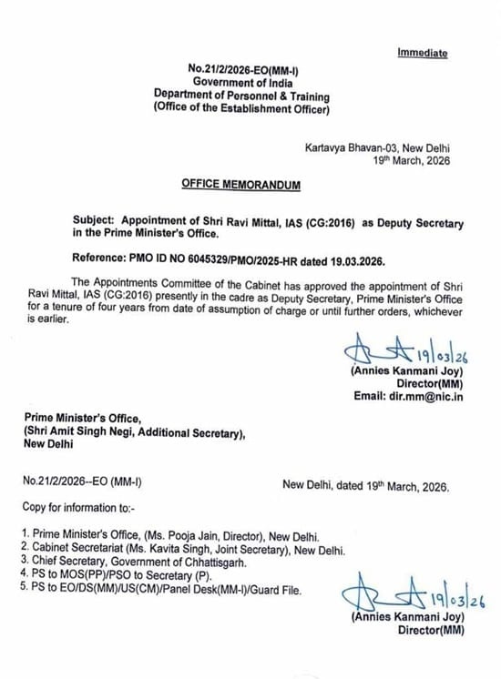 इस आदेश में साफतौर पर लिखा है कि डॉ. रवि मित्तल का कार्यकाल चार साल का होगा, जो उनके कार्यभार ग्रहण करने की तारीख से प्रभावशील होगा। हालांकि प्रशासनिक लिहाज से उनके कार्यकाल में बदलाव भी किया जा सकता है। जारी आदेश के मुताबिक, मंत्रिमंडल की नियुक्ति समिति ने आईएएस रवि मित्तल (छत्तीसगढ़ कैडर – 2016) को प्रधानमंत्री कार्यालय में उप सचिव के पद पर नियुक्त करने की स्वीकृति मंजूर कर दी है। इसमें स्पष्ट है कि यह प्रतिनियुक्ति चार वर्षों के तय कार्यकाल के लिए ही है, लेकिन जरूरत पड़ने पर इसमें बदलाव भी किया जा सकता है। ऐसे में यह नियुक्ति अगले आदेश तक भी प्रभावी रहेगी। फिलहाल, ये जिम्मेदारी उनके प्रशासनिक सफर को नई दिशा दे सकती है। पीएमओ में उनकी नियुक्ति को प्रदेश के लिए अहम माना जा रहा है, क्योंकि इससे केंद्र में छत्तीसगढ़ कैडर की भागीदारी मजबूत होगी।