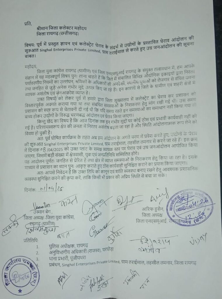 रायगढ़। जिले में संचालित औद्योगिक इकाइयों के खिलाफ स्थानीय रोजगार, पर्यावरण प्रदूषण, श्रमिक सुरक्षा और जनहित से जुड़े मुद्दों को लेकर अब आंदोलन और तेज होने जा रहा है। जिला युवा कांग्रेस (ग्रामीण) अध्यक्ष उस्मान बेग एवं जिला एनएसयूआई अध्यक्ष आरिफ हुसैन के नेतृत्व में आंदोलन के अगले चरण की शुरुआत 08 अप्रैल को ग्राम तराईमाल स्थित सिंघल एंटरप्राइजेज प्राइवेट लिमिटेड प्लांट के घेराव से की जाएगी।